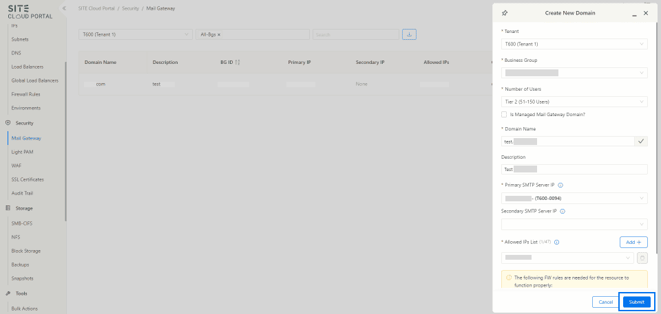 7- FW Rules (either click the checkbox for automatic creation by the Portal or manually open the FW Rules to ensure traffic between the Mail Exchange Server and SITE Mail Gateway)