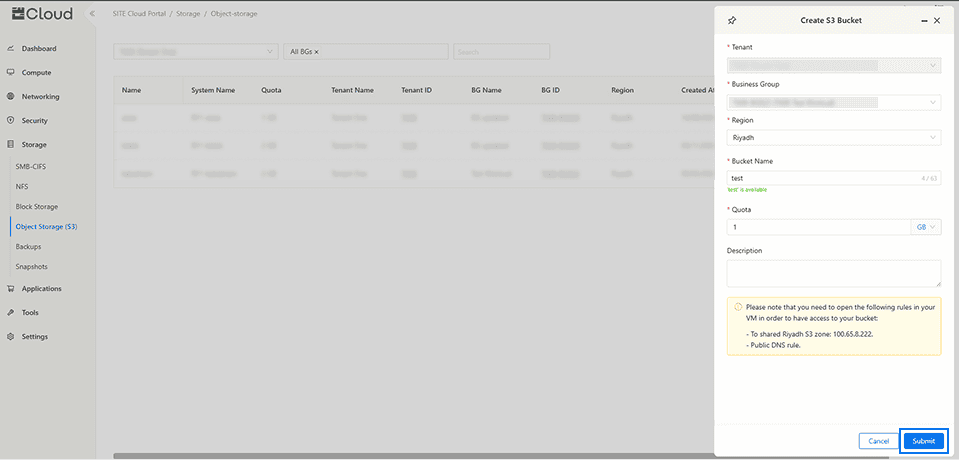 2.1 After clicking "Create", a modal will appear prompting you to fill in the required fields, including a unique bucket name; once completed, click "Submit" to initiate the creation of your bucket.