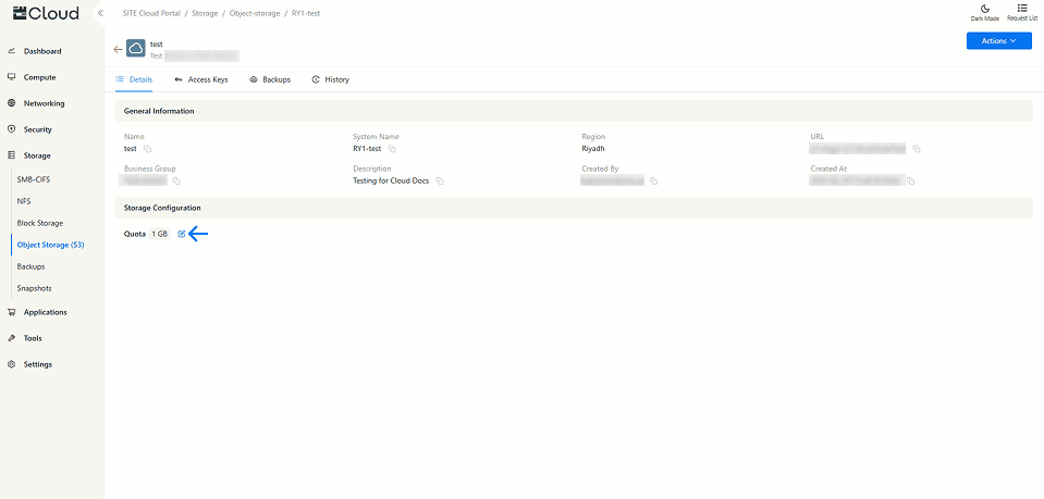 3.1 By clicking on the bucket name, a Details Tab will appear showing general information about your bucket and its storage configuration. From this tab, you can also edit your storage quota.