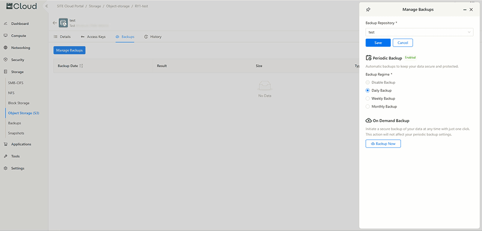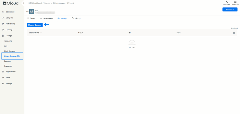 1- Access your bucket, navigate to the “Backups” tab, and click the “Manage Backup” button. If you do not have an existing bucket, please refer to the Object Storage (S3) documentation for guidance on creating one.