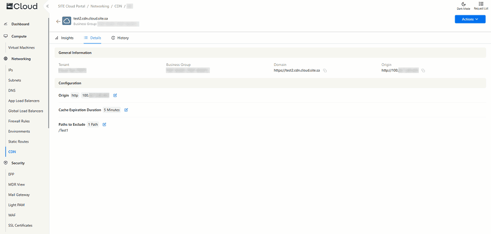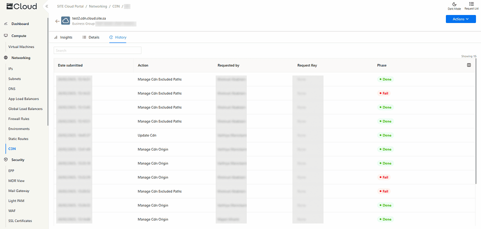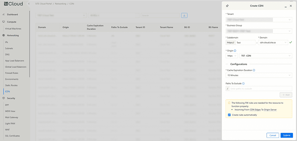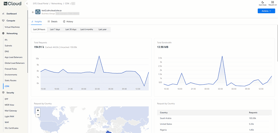 SITE Cloud CDN is a web service designed to speed up the delivery of your static and dynamic web content, such as .html, .css, .js, and image files, to users. It also adds an extra layer of security by offloading traffic and serving as a protective barrier between the end user and the origin server. The service distributes content through a regional network of data centers in Riyadh and Jeddah. When a user requests content from SITE Cloud CDN, the request is directed to the edge location with the lowest latency, ensuring optimal performance for content delivery.