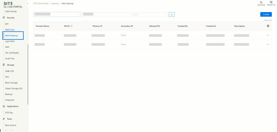 To create a new domain, the MX[2] record must be mapped to SITE Cloud MX records.