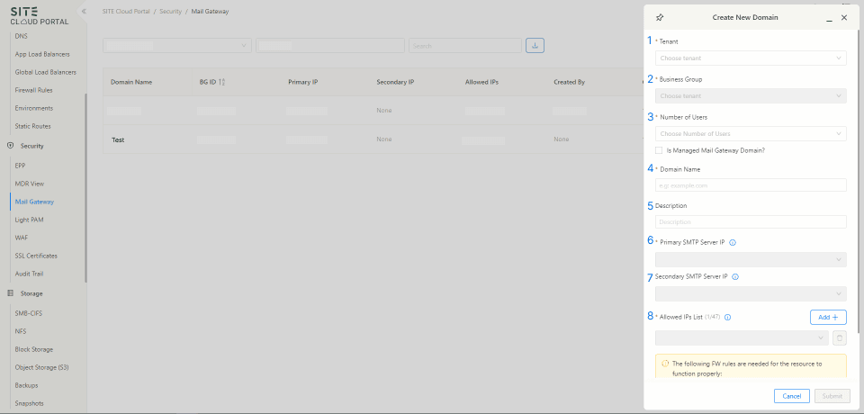 To create a new domain, an outgoing rule must be established from Mail Gateway IPs to Mail Server VM/LB[3] IPs.