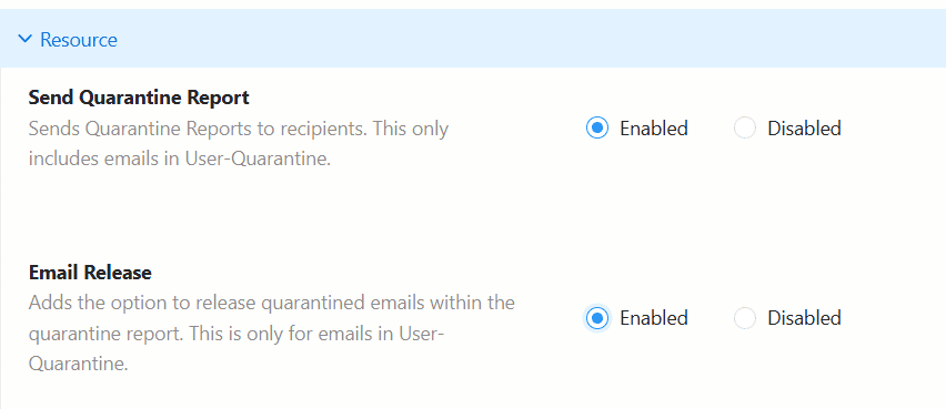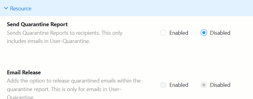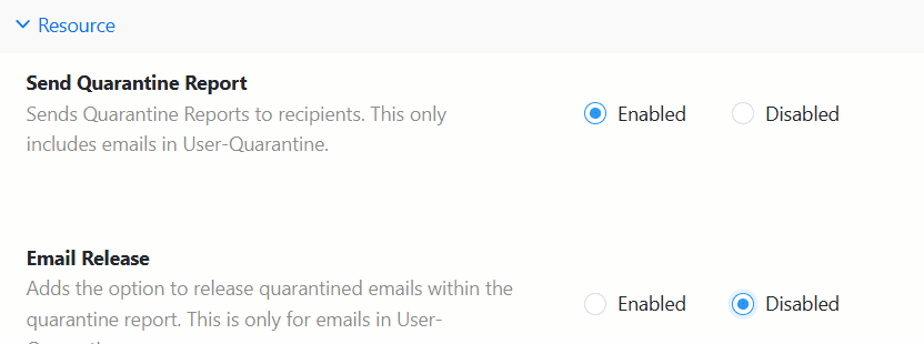 If Send Quarantine Report is disabled, Email Release will be disabled by default, and users will not receive the report or be able to release any emails.