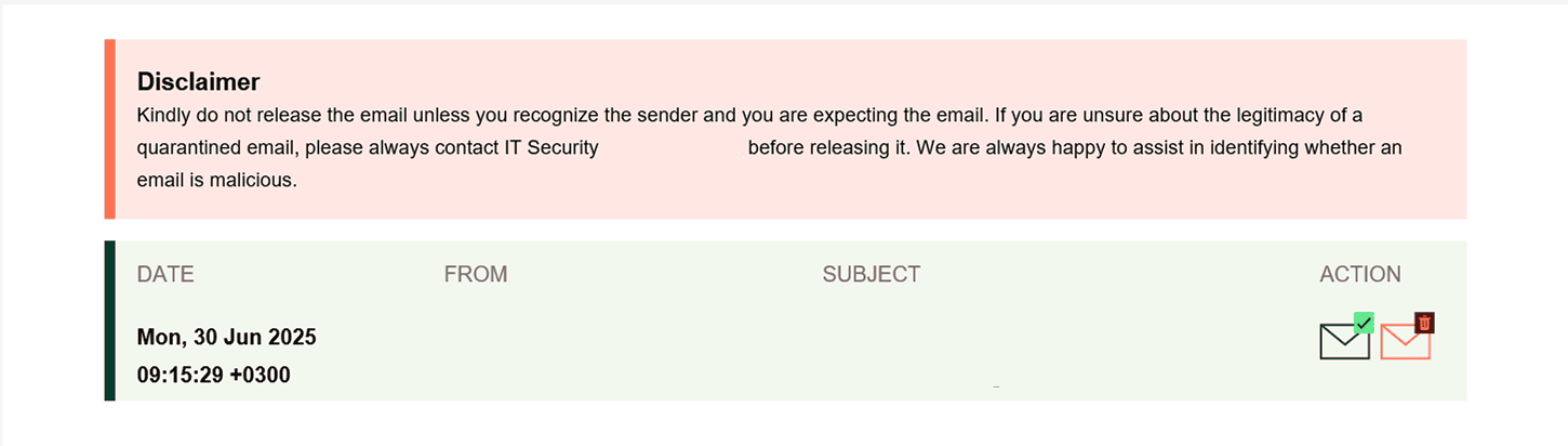 - Instructions or a link for the recipient to review and release the email if it is safe