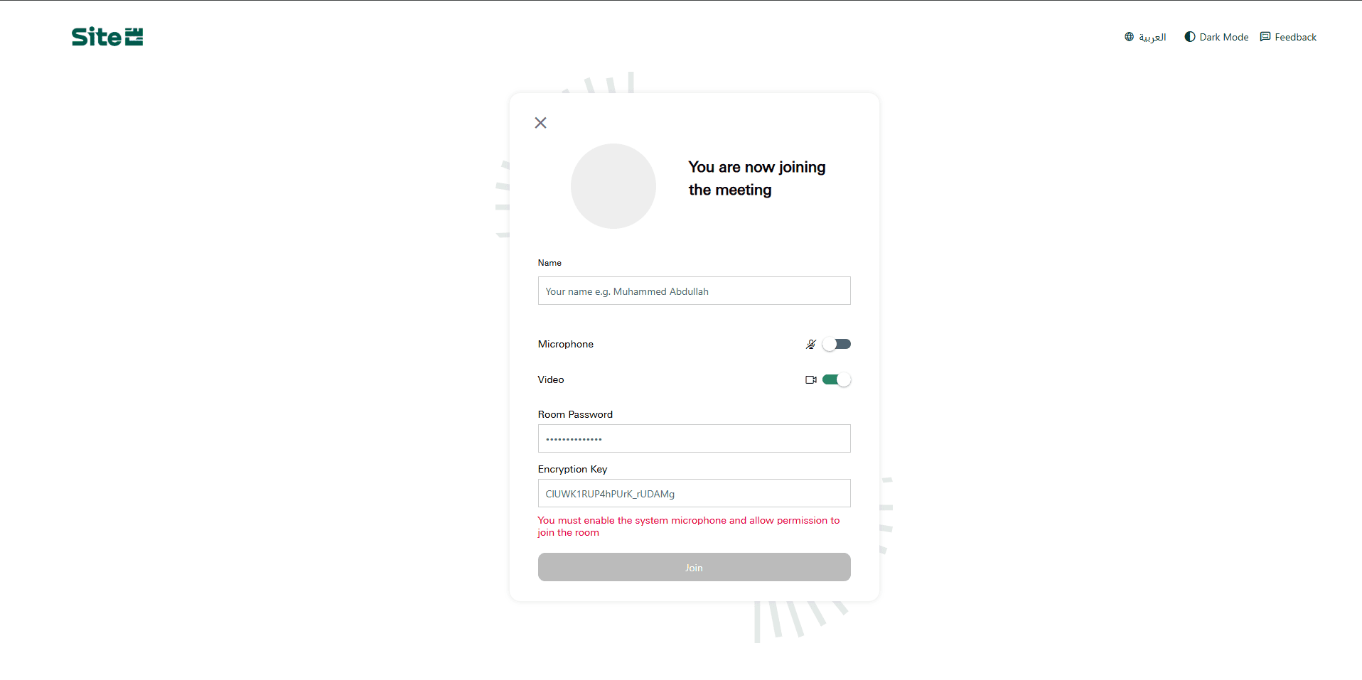 If you are a participant, enter the room password and encryption key
