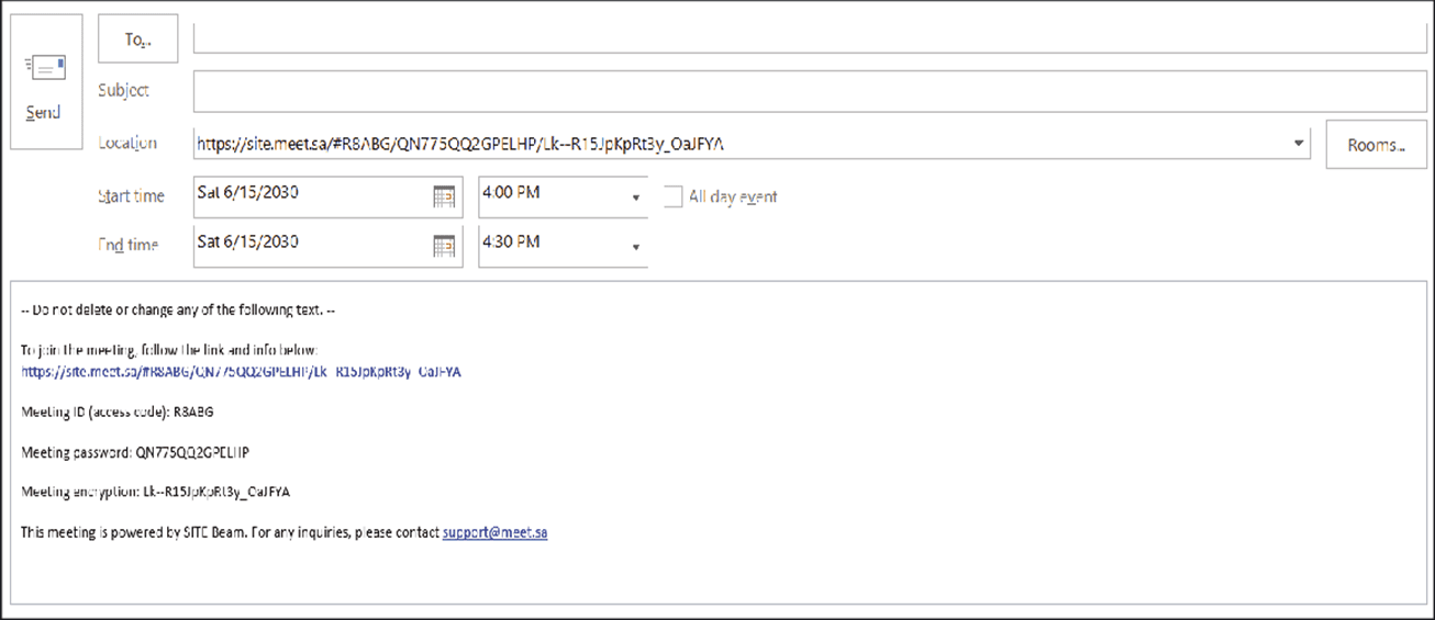 The meeting room details will appear in the body of the message.