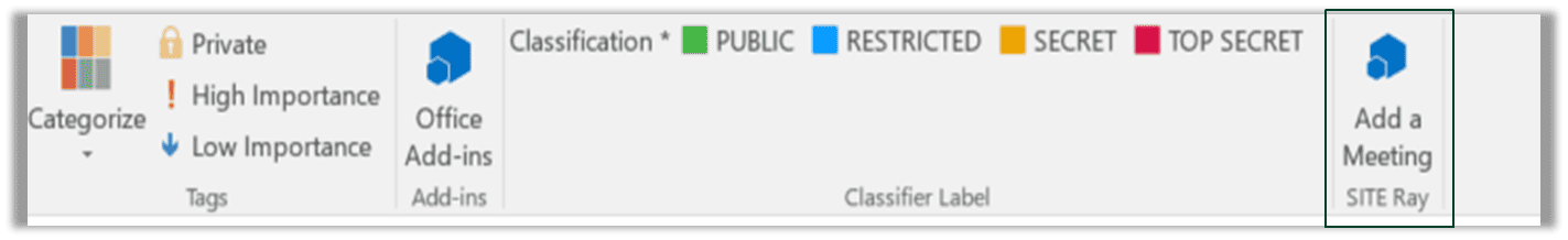 Or from your outlook calendar click new meeting then SITE RAYS ’s "Add a Meeting" from the top toolbar.