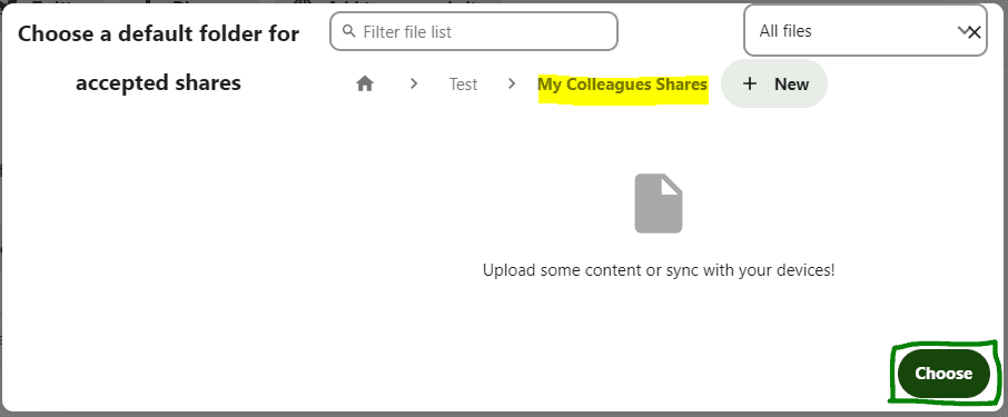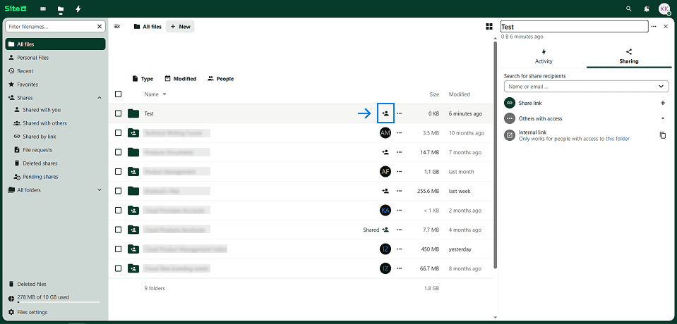 Now, let’s take the “internal sharing option” option, by clicking on the field right above the share link, then typing the name of the person you want to share the folder with.