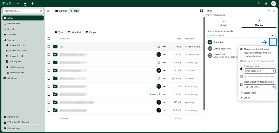 By clicking on the plus symbol, prior to generating a link, the system will ask you to enter a password. This password will be used to protect the link with it, and to be shared with the authorized recipients ( should be shared in a separate channel ).