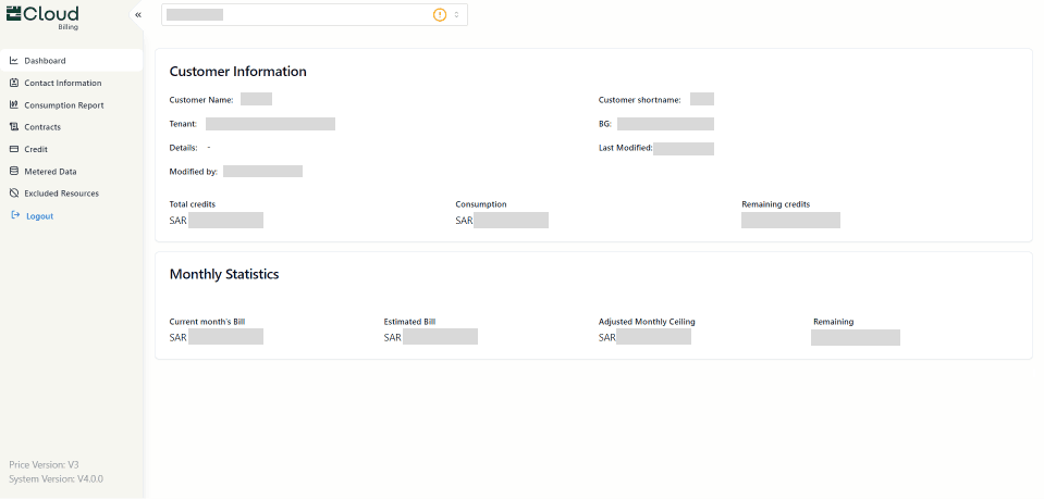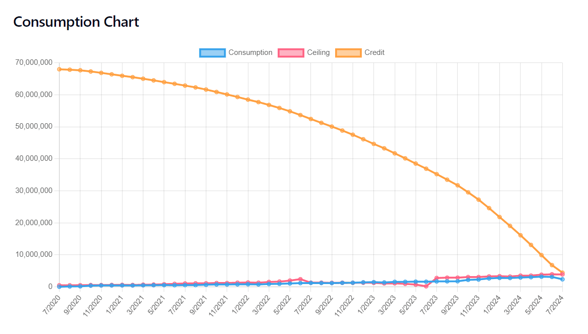 The Billing Dashboard serves as the main page where key information related to your account is displayed. It offers an overview of your account's credits, usage, and remaining balance, while also providing detailed statistics and a visual chart to help you track your consumption over time.